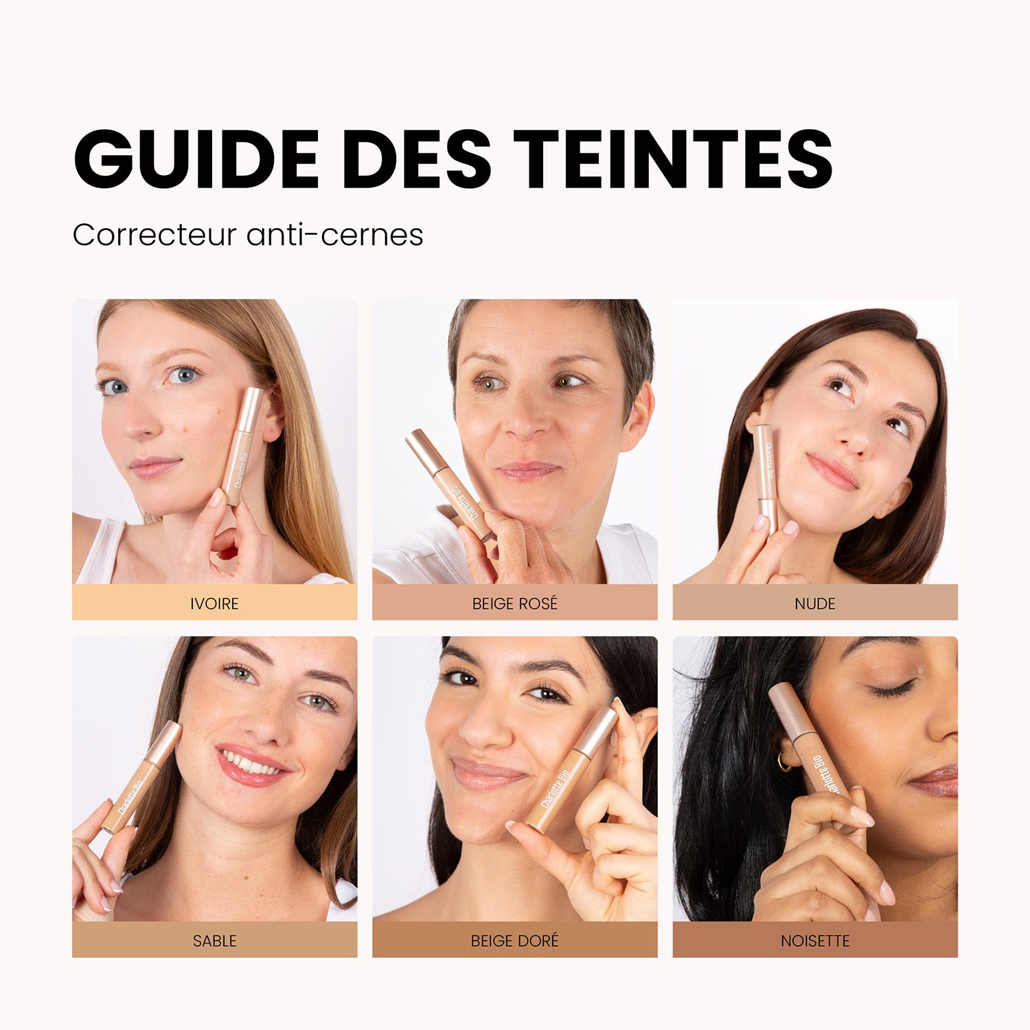 Pour illuminer le regard, privilégiez une teinte légèrement plus claire que votre fond de teint, BB Crème ou CC Crème. Si vos cernes sont marqués ou colorés, une teinte proche de votre carnation assurera une meilleure correction.