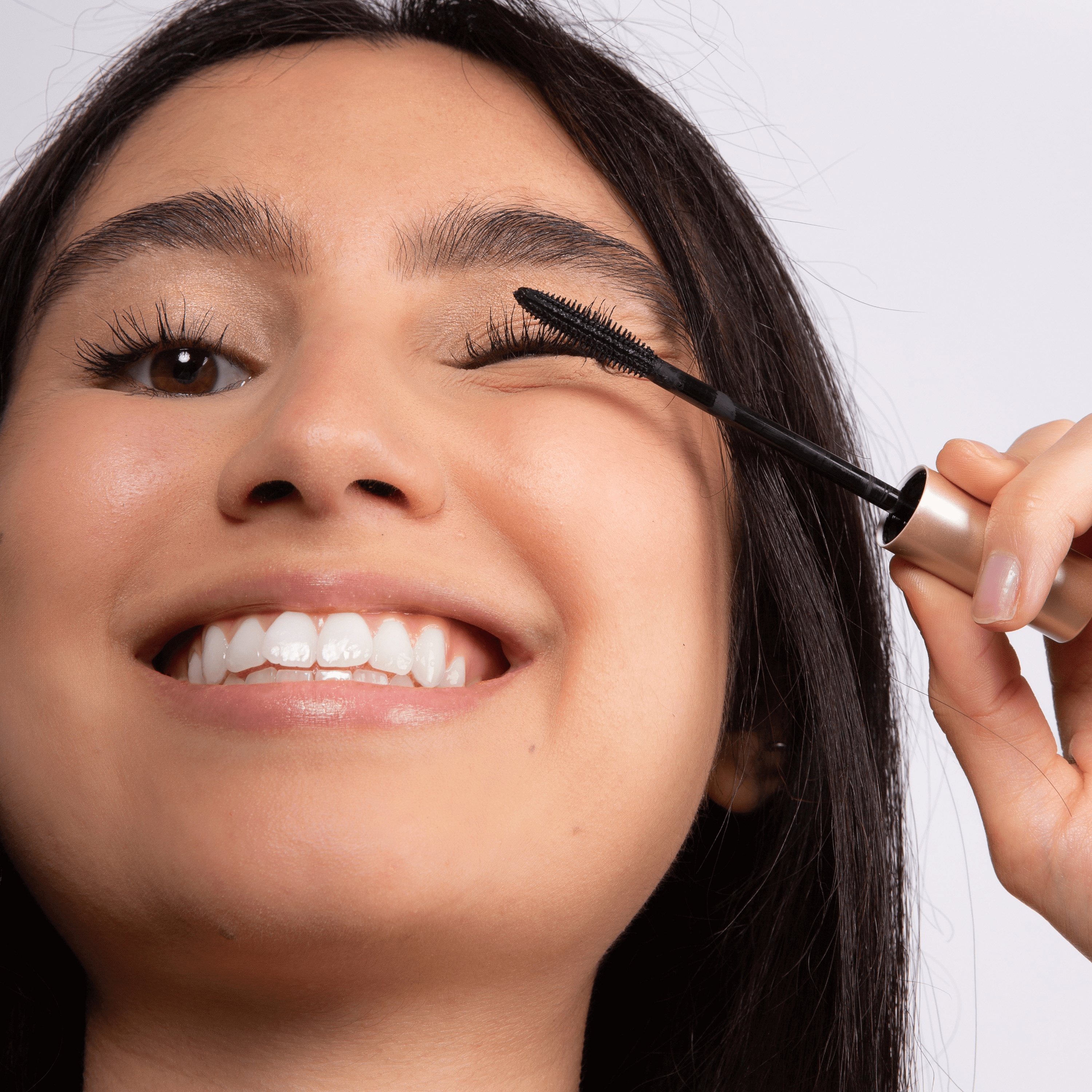 Beenden Sie Ihr Augen-Make-up mit unserer Mascara mit natürlichem Volumen-Boost. Nachdem Sie eine Wimpernzange verwendet haben, tragen Sie die Mascara auf, indem Sie die Bürste am W impernansatz ansetzen und zu den Spitzen hin auftragen. Führen Sie eine Zickzack-Bewegung aus, um das Material gleichmäßig und ohne Klumpen zu verteilen.