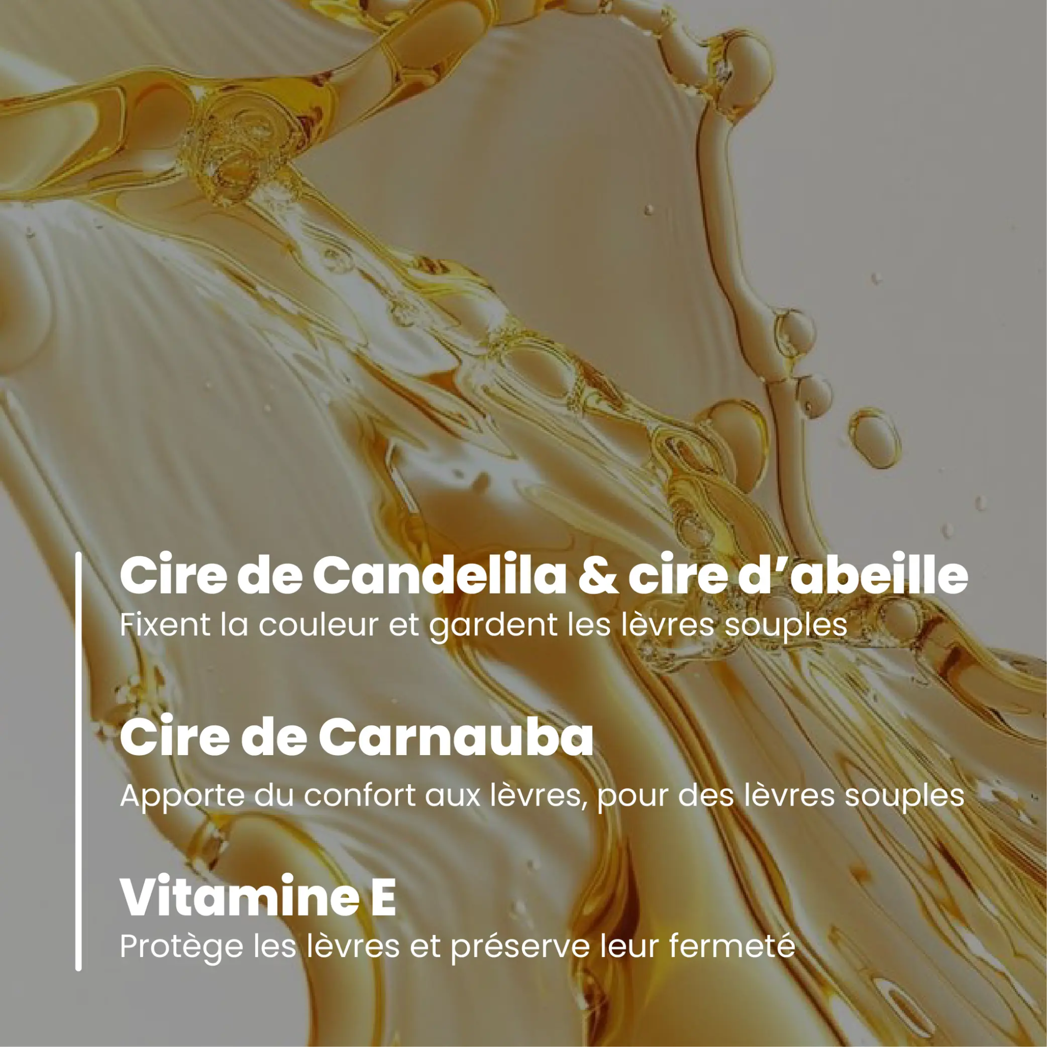 Vitamine E, cires de candelila, de carnauba et d'abeille